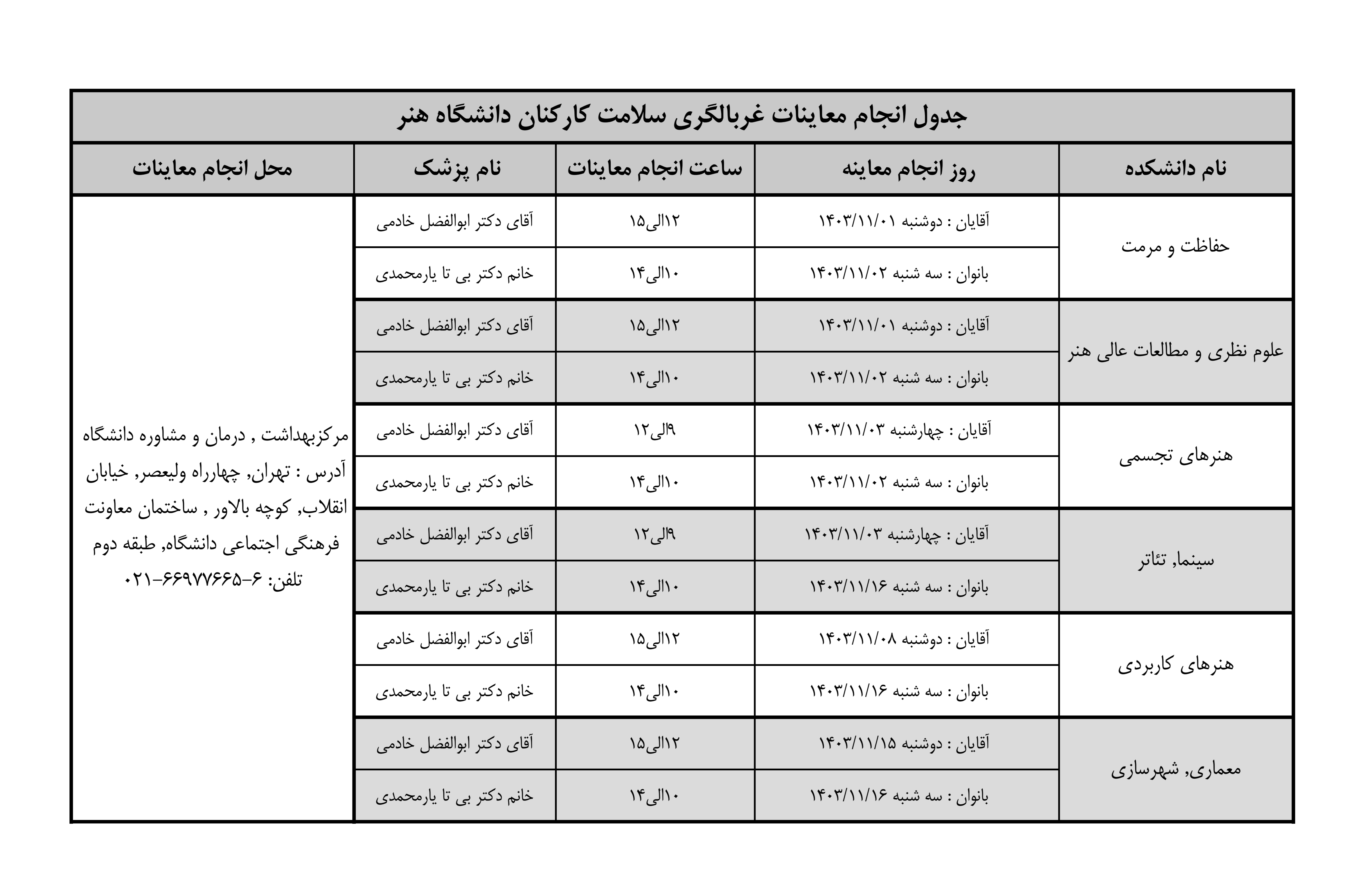 جدول انجام معاینات غربالگری سلامت کارکنان دانشگاه هنر ۲۹ دی ۱۴۰۳ | ۰۹:۳۴ کد : ۶۶۹۱ خبرها و اطلاعیهها ارسال به دیگران نام شما ایمیل شما ایمیل دریافتکننده ارسال انصراف تعداد بازدید:۲۹۰