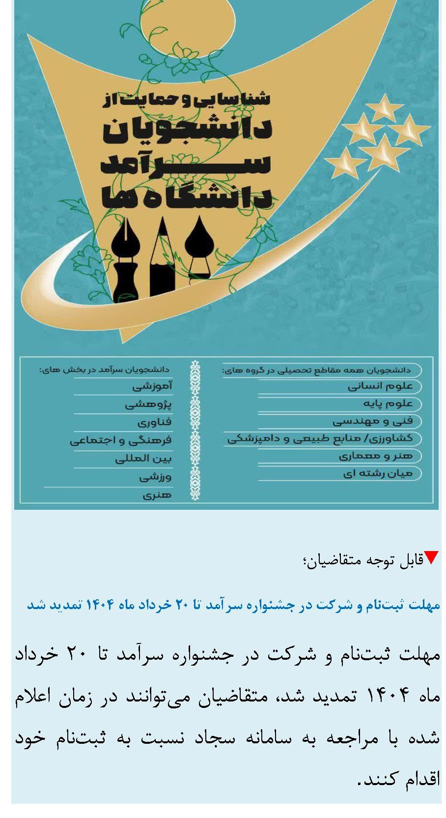 به اطلاع می رساند: دومین دوره جشنواره دانشجویان سرآمد از ابتدای اردیبهشت ماه آغاز خواهد شد.